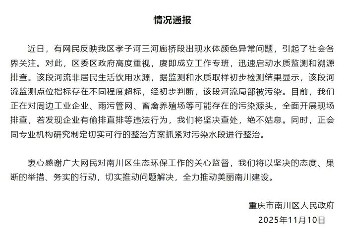 据新京报我们视频此前报道,11月10日,重庆南川区有网民告诉记者,孝子河有区段河水发黑,有刺鼻气味。网民称:“黑色区域河水往下游流,长度看不到头”。记者从南川区生态环境局获悉,9日、10日均有工作人员赴现场调查。